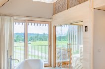 In seinem Erscheinungsbild sowie in seiner Konstruktion ist der Neubau durch den Werkstoff Holz geprägt. Diverse Fassadenlayer vor Verglasungen stellen zum einen Sichtschutz dar und schaffen zugleich ein spannendes Wechselspiel zwischen Licht und Schatten. Die einzelnen Fassaden erhalten zudem durch diese Layer eine ruhige, selbstverständliche Taktung.