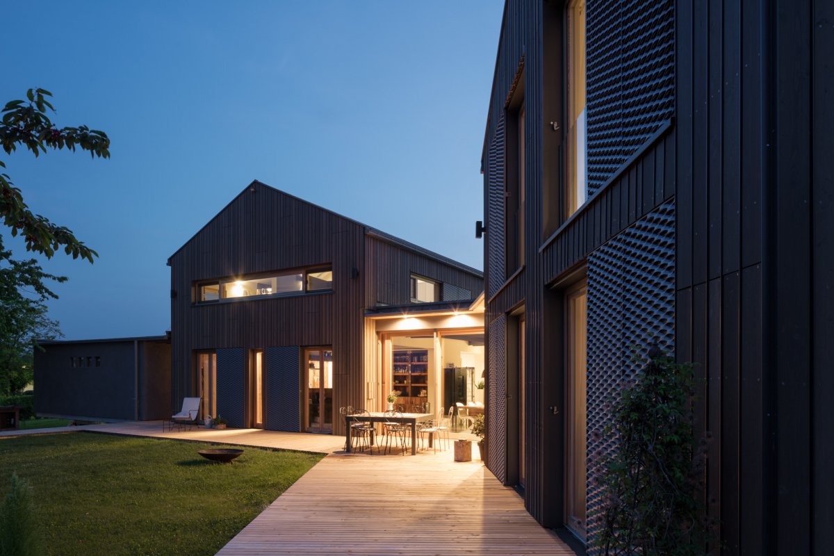 Schmale Giebelflächen sorgen für ein kompaktes und gleichzeitig ästhetisches Erscheinungsbild. Die Holzfassaden, Holzfenster und Streckmetall-Schiebeläden erzeugen eine natürliche, modern-schlichte Optik. Auch ökologisch punktet das Holzhaus mit einer ressourcenschonenden Bauweise durch überwiegend Holzrahmenbauweise sowie geringem Energieaufwand im laufenden Betrieb durch Erdwärme-Flächenkollektoren.